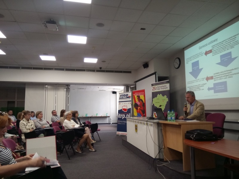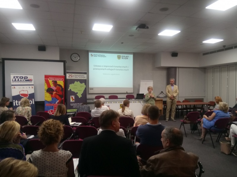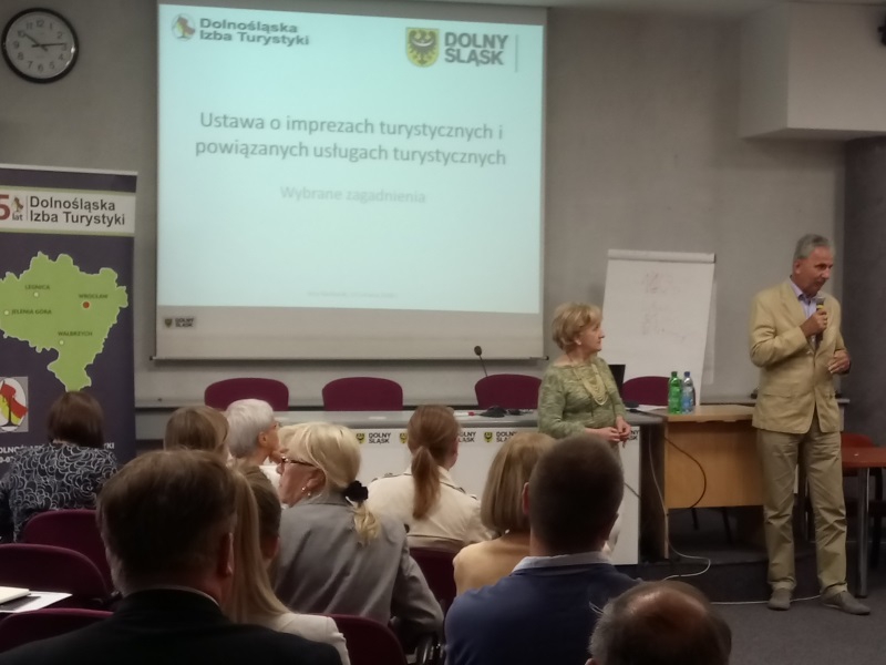 W piątek 22 czerwca w Sali konferencyjnej Urzędu Marszałkowskiego Województwa Dolnośląskiego we Wrocławiu odbyło się szkolenie z przepisów Ustawy o imprezach turystycznych i powiązanych usługach turystycznych. Organizatorami byli Dolnośląska Izba Turystyki i Wydział Turystyki Urzędu Marszałkowskiego, co pozwoliło na zaproszenie do udziału również przedstawicieli firm i instytucji nie zrzeszonych w DIT. W szkoleniu uczestniczyło ponad 70 osób, zainteresowanych zmianami legislacyjnymi w obszarze turystyki. Uczestników szkolenia powitała Pani Wiceprezes DIT – Danuta Nawrocka, dziękując wszystkim za przybycie oraz za pomoc w organizacji Przedstawicielom Urzędu Marszałkowskiego.